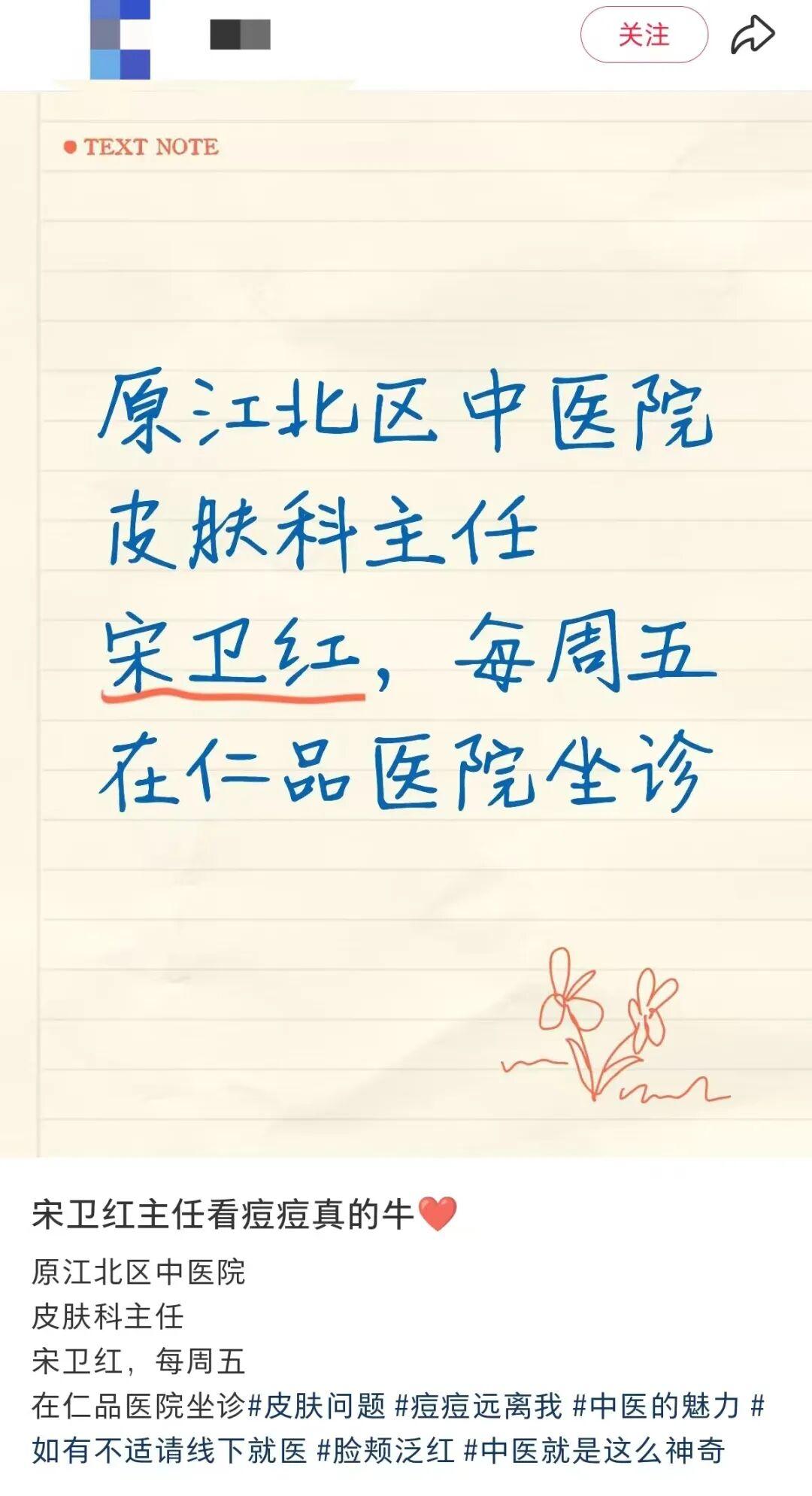 就在小张对着手机屏幕崩溃落泪时,一条关于“原江北区中医院皮肤科主任宋卫红在仁品医院坐诊”的笔记让她抓住了救命稻草。