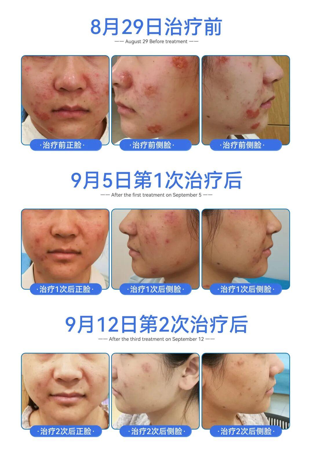 配合着中药和情绪疏导,治疗1周后,小张的皮损、红肿开始消退;2周后,只剩下了淡淡的痘印。现在的小张,不仅摘下了口罩,脸上也有了笑容。第三次复诊,外面下着大雨她也坚持来找宋主任。